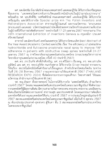 แห่งชาติ : รางวัลผลงานวิจัย ประจำาปีงบประมาณ 2567 ในวันที� 2 กุมภาพันธ์ 2567 2567 สมาคมแพทย์สตรีแห่งประเทศไทยในพระบรมราชินูปถุัมภ์ เมื�อวันที� 6 ตุลาคม 2567