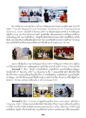 การวิจัย คณะได้จัดโครงการเพิ�มพูนศักยภาพนักวิจัย ประจำาปี 2567 จำานวน 3 กิจกรรม คือ - โครงการให้คำาปรึกษาด้านยาแก่ผู้ป่วย และบริการวิชาการแก่บุคลากร
