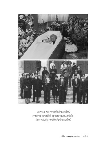 (ภาพบน) ศพนายปรีดีในบ้านอองโตนี (ภาพล่าง) ฉลบชลัยย์ (ผู้หญิงสวมแว่นบนบันได) ร่วมงานรับอัฐินายปรีดีกลับบ้านอองโตนี ปรีดีบรรณานุสรณ์ ๒๕๖๓ ๑๐๑