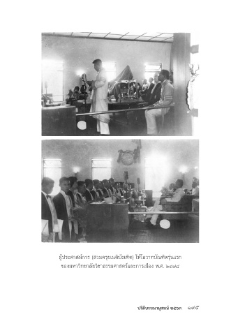 ผู้ประศาสน์การ (สวมครุยเนติบัณฑิต) ให้โอวาทบัณฑิตรุ่นแรก ของมหาวิทยาลัยวิชาธรรมศาสตร์และการเมือง พ.ศ. ๒๔7๘ ปรีดีบรรณานุสรณ์ ๒๕๖๓ ๑๙๕