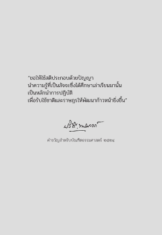 “ขอให้ใช้สติประกอบด้วยปัญญา นําความรู้ที่เป็นสัจจะซึ่งได้ศึกษาเล่าเรียนมานั้น เป็นหลักนําการปฏิบัติ เพื่อรับใช้ชาติและราษฎรให้พัฒนาก้าวหน้ายิ่งขึ้น” คําขวัญสําหรับบัณฑิตธรรมศาสตร์ ๒๕๒๔