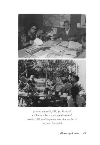 (ภาพบน) ฉลบชลัยย์, ปรีดี, สุภา ศิริมานนท์ บนโต๊ะอาหาร ห้องอเนกประสงค์ บ้านอองโตนี (ภาพล่าง) ปรีดี, กนต์ธีร์ ศุภมงคล, ฉลบชลัยย์ และมิตรเก่า ในสวนหลังบ้านอองโตนี ปรีดีบรรณานุสรณ์ ๒๕๖๓ ๙๕